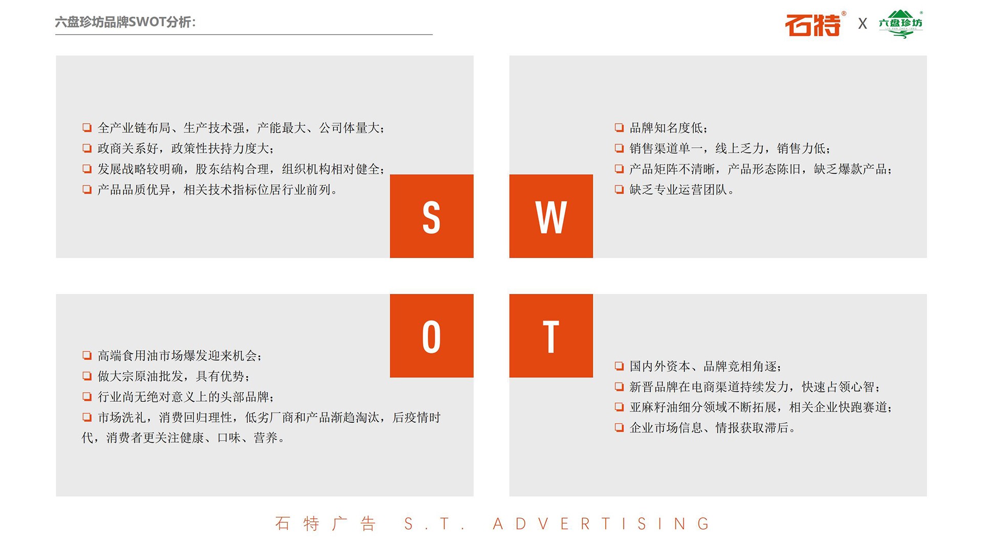 石特廣告在進(jìn)行實(shí)地考察時(shí),走訪了亞麻花的種植地、生產(chǎn)廠區(qū)、辦公區(qū)域,并查閱了相關(guān)資料,分析得出了六盤珍坊的目標(biāo)市場(chǎng)、品類趨勢(shì)、市場(chǎng)形態(tài)和競爭環(huán)境,并結(jié)合對(duì)品牌的SWOT分析,梳理并聚焦了企業(yè)目前存在的問題。