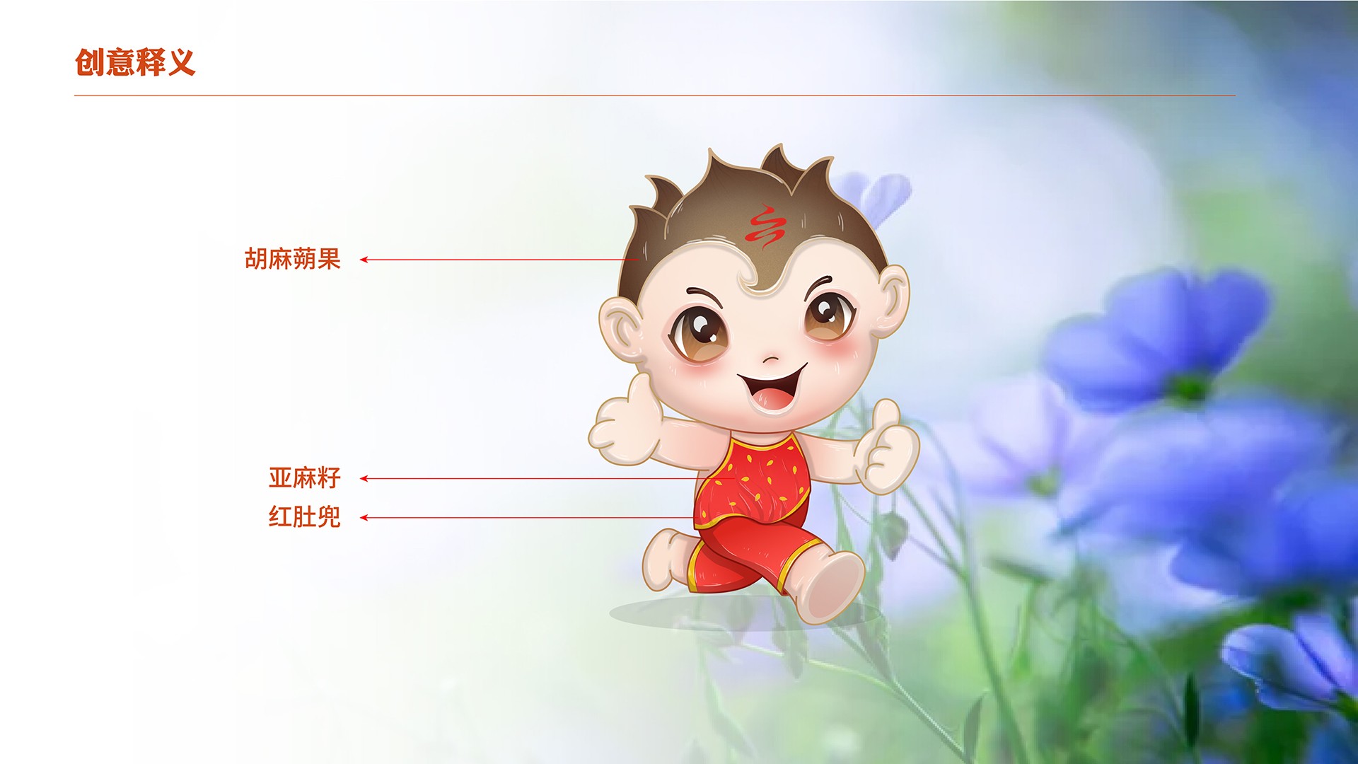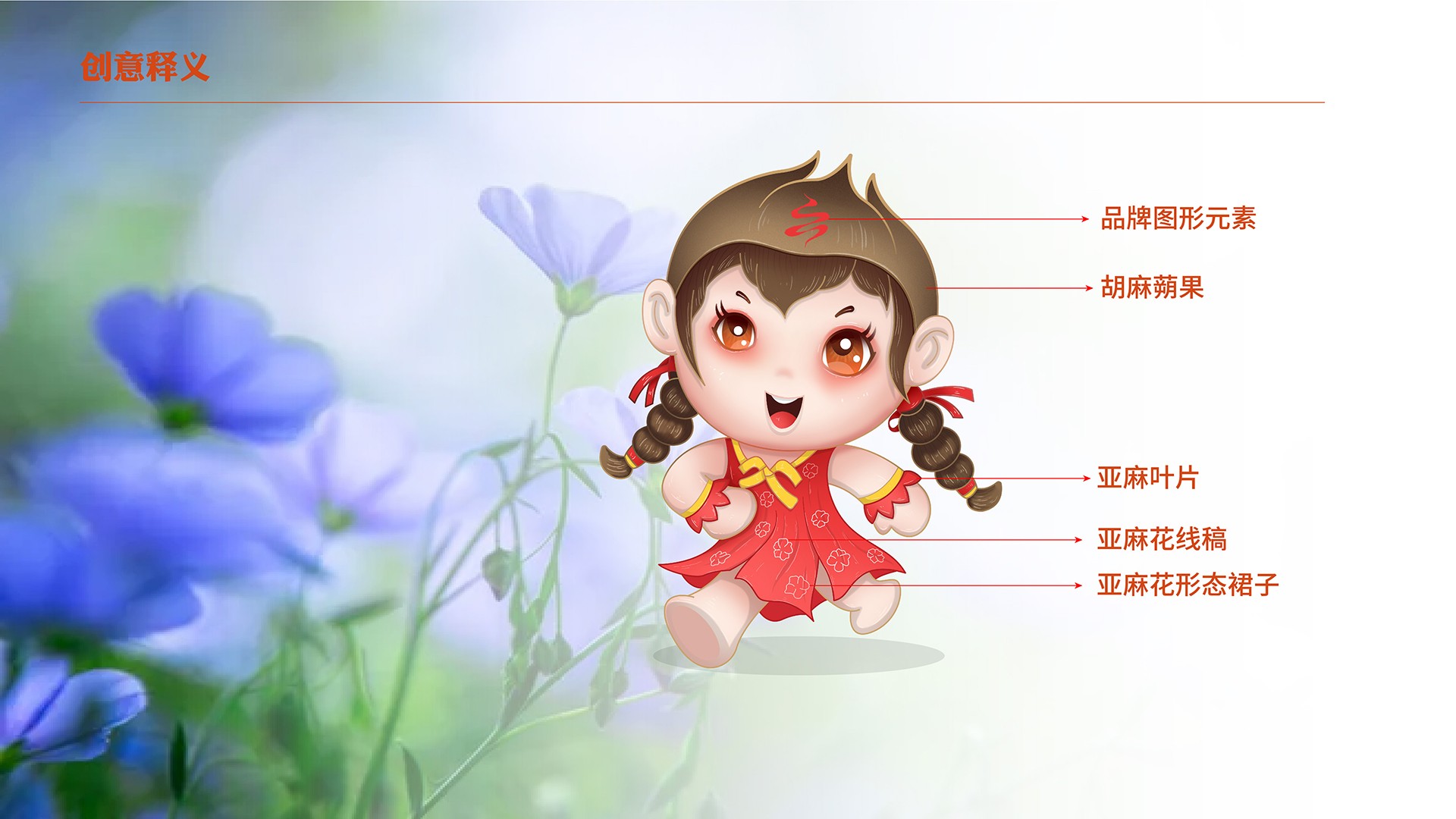 4、產(chǎn)品屬性:亞麻籽油是亞麻花的提取物,在女娃的設(shè)計(jì)上綠色手繩為亞麻花葉,衣裙為紫是亞麻花的顏色,裙子上的斑點(diǎn)是亞麻花,裙身下擺整體也勾勒出亞麻花的形態(tài);男娃設(shè)定上,肚兜的斑點(diǎn)為亞麻籽。