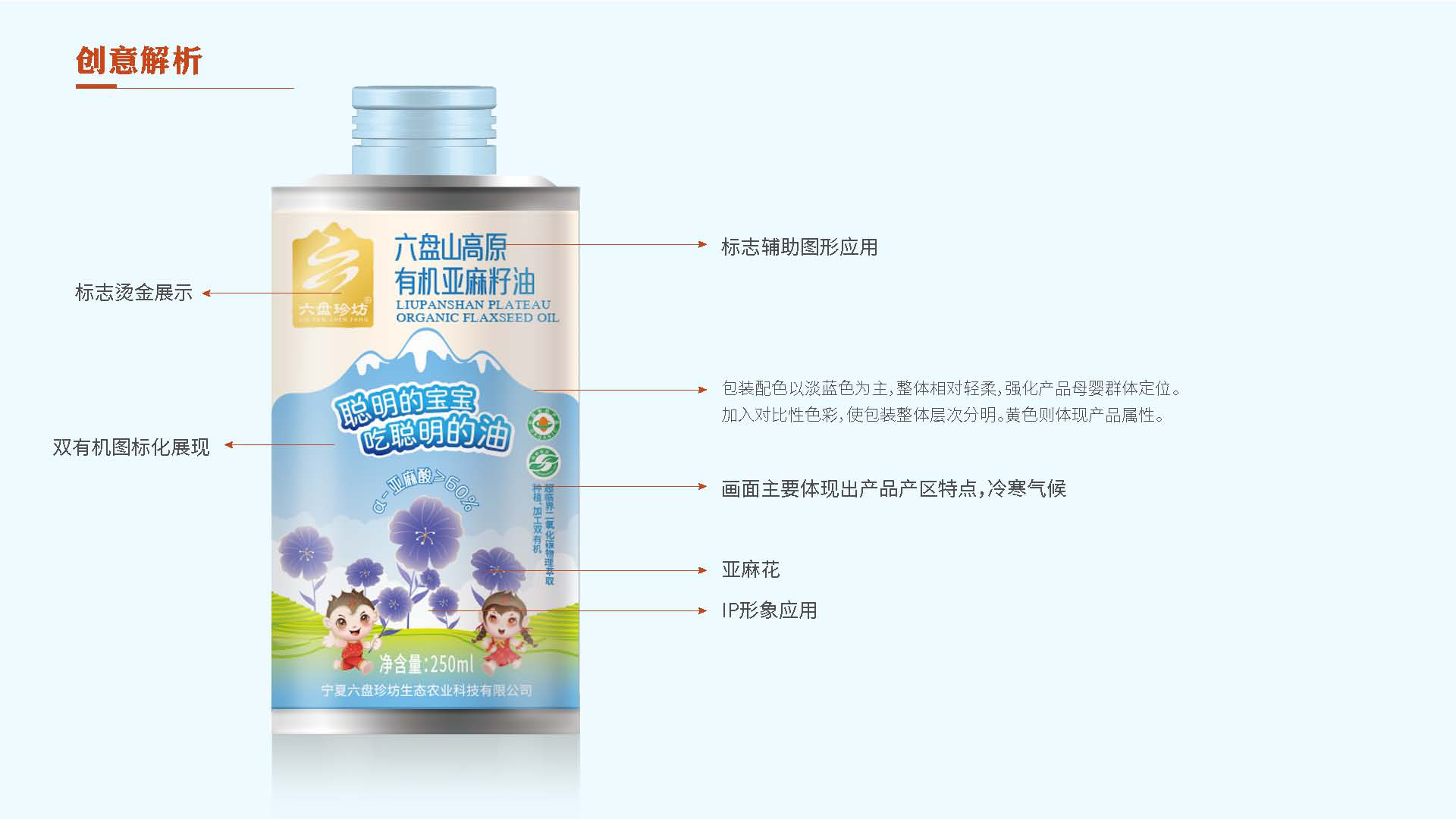 亞麻花生長在高寒冷涼的六盤山,結(jié)合氣候特征與六盤山的紅色文化,我們從冷、紅二字出發(fā)尋找六盤珍坊的形象代言人。冷靜的頭腦遇上紅色的熱情,一個(gè)生動(dòng)的六盤山孩童形象躍然紙上,結(jié)合六盤珍坊的行業(yè)屬性、品牌調(diào)性與產(chǎn)品特性,賦予其完善的人格化色彩,取名“冷娃”,六盤珍坊的IP形象——冷娃誕生了!一個(gè)生動(dòng)活潑的孩童將六盤珍坊與寧夏六盤山、亞麻籽油的產(chǎn)品屬性相連。