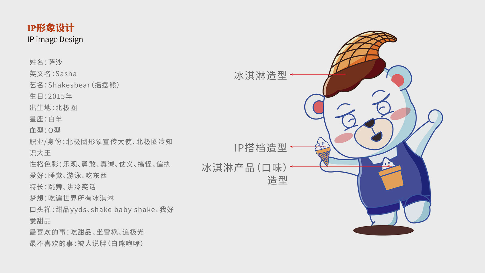 莎莎熊IP形象需具備商標、畫面模特、宣傳推銷等多方面功能,并具有商標和模特不具有的優勢。在選定北極熊作為創作原型的基礎上,結合莎莎熊行業屬性、品牌調性與產品特性,我們需要賦予其完善的人格化色彩,使之有血有肉,自帶良好的傳播屬性。