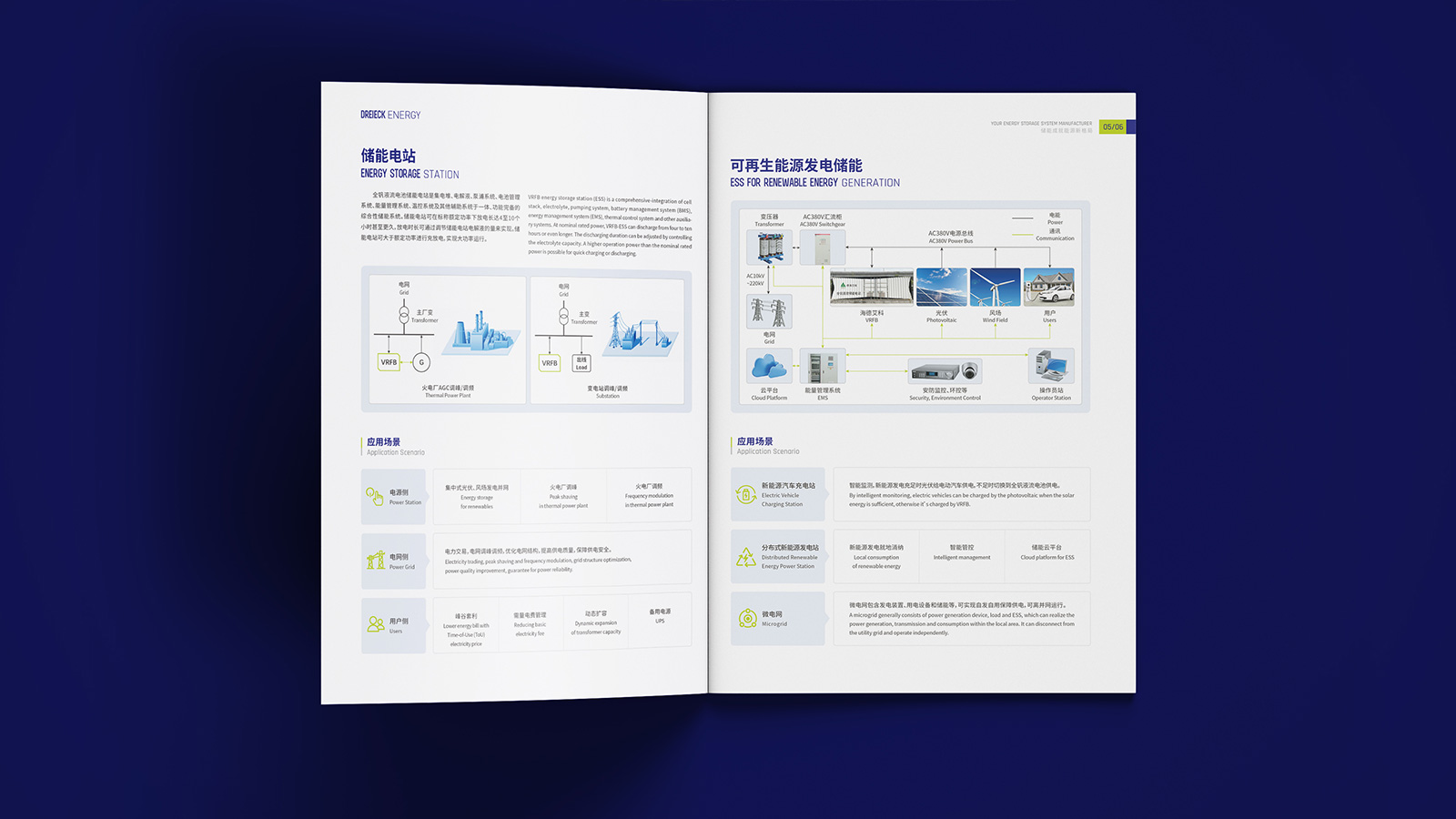 企業的畫冊設計要站在品牌建設的高度,不僅需要展現企業的品牌形象,還需要設計出品牌的個性來,基于此,在此次的畫冊設計中,石特提出了新的想法。封面封底以淡綠色和深藍色為主,帶給人一種嚴謹務實、值得信任的感覺;內容上首先以圖文結合的形式先對企業的基本情況進行介紹,然后闡述了全釩液流電池技術的原理以及應用場景,并對儲能電站的相關知識進行了科普,最后以典型案例、產品系列、資質認證的介紹為結尾,該畫冊簡潔美觀、主次分明,德海艾科人嚴謹務實的工作態度和創新的精神得到了系統且充分的展示。