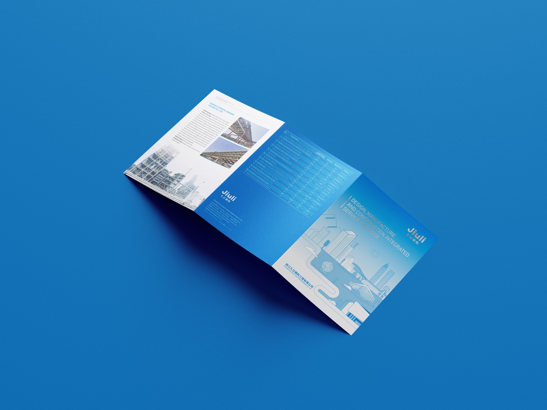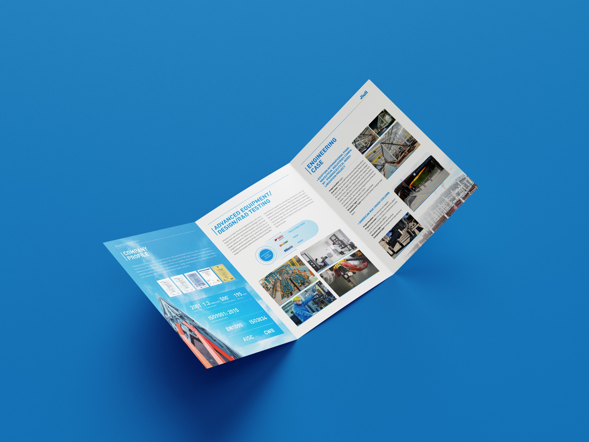 一、設計理念與目標:本次鋼結構公司宣傳三折頁設計,我們秉持專業、創新和實用的設計理念,旨在通過獨特的視覺呈現和精準的信息傳達,充分展示公司的實力、技術水平和業務范圍,樹立公司品牌形象,吸引潛在客戶的關注。