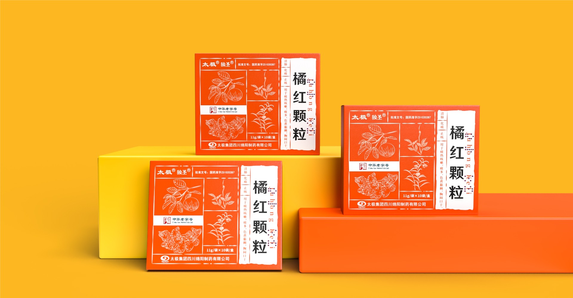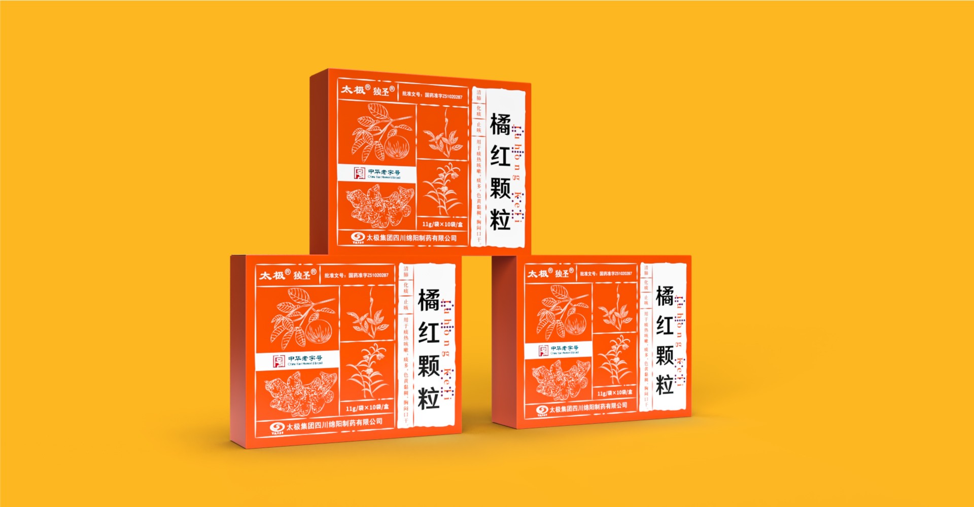 圖案設計上,包裝巧妙地運用了植物元素,一朵花、一片葉子和一個果實的組合,不僅美觀大方,而且寓意著中藥來源于自然、回歸自然的理念。這些圖案與“橘紅顆?!钡拿Q相呼應,強化了產品的中草藥特性。