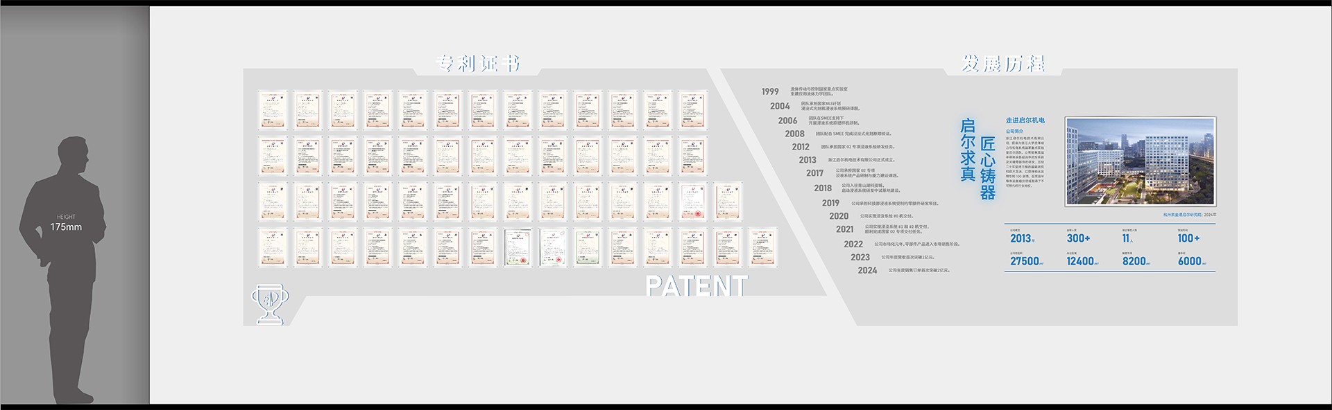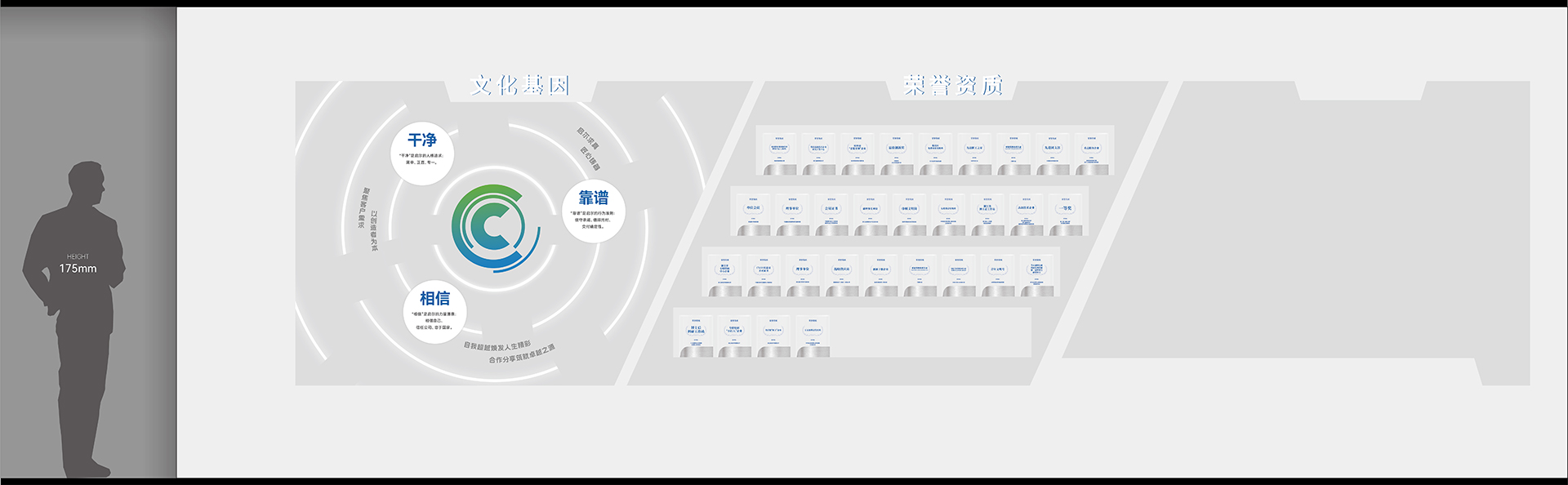 2. 序廳(品牌形象區)設計元素:采用高科技感的LED大屏播放公司宣傳片,結合動態光影效果,營造震撼的視覺效果。墻面設置企業形象墻,展示公司歷史沿革、榮譽獎項及核心團隊介紹。亮點:設置AR互動裝置,參觀者可通過手機或特定設備掃描二維碼,虛擬體驗公司發展歷程中的重要時刻。
