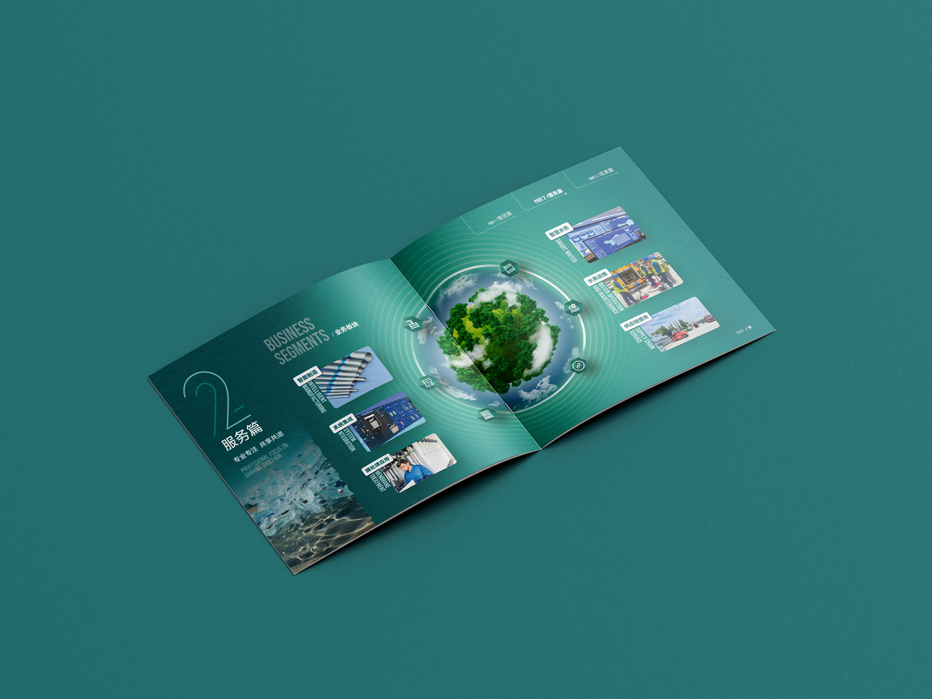 1?? 科技藍(lán)×生態(tài)綠碰撞 封面以深海藍(lán)為主基調(diào),疊加動態(tài)水波紋光效與分子結(jié)構(gòu)抽象線條,內(nèi)頁融合實拍水廠工程圖與3D技術(shù)拆解動畫,硬核科技與生態(tài)美學(xué)并存,呼應(yīng)“水聯(lián)萬物,科創(chuàng)新生”品牌理念。 2?? 復(fù)雜業(yè)務(wù)可視化 將“不銹鋼復(fù)合管生產(chǎn)”“設(shè)備集成總包”等專業(yè)業(yè)務(wù),轉(zhuǎn)化為“全產(chǎn)業(yè)鏈流程圖+數(shù)據(jù)看板”,搭配中英雙語解讀,政府匯報、國際招商場景通吃!更用“年均6.5億營收”“國家高新企業(yè)”等關(guān)鍵數(shù)據(jù)強化行業(yè)地位。 3?? 沉浸式場景營銷 借鑒頭部環(huán)保畫冊設(shè)計思路,通過航拍水處理廠、微觀水質(zhì)凈化對比實驗等創(chuàng)意攝影,打造“一滴水的凈化之旅”敘事線,讓客戶秒懂技術(shù)價值。
