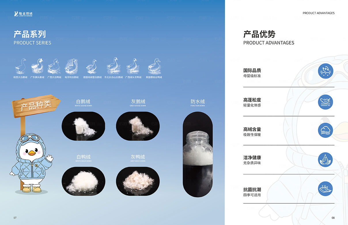 設(shè)計(jì)階段,團(tuán)隊(duì)以 “簡(jiǎn)約大氣、凸顯質(zhì)感” 為原則,將羽絨制品的柔軟屬性與企業(yè)的專業(yè)形象相融合。在色彩選擇上,采用淺色系為主色調(diào),搭配品牌特色色作為點(diǎn)綴,營(yíng)造舒適、高端的視覺(jué)氛圍;在版式設(shè)計(jì)上,注重信息層級(jí)的清晰呈現(xiàn),通過(guò)合理的留白、圖文配比,讓讀者能夠輕松獲取關(guān)鍵信息,同時(shí)融入羽絨紋理、羽毛等元素作為設(shè)計(jì)細(xì)節(jié),強(qiáng)化品牌辨識(shí)度。
