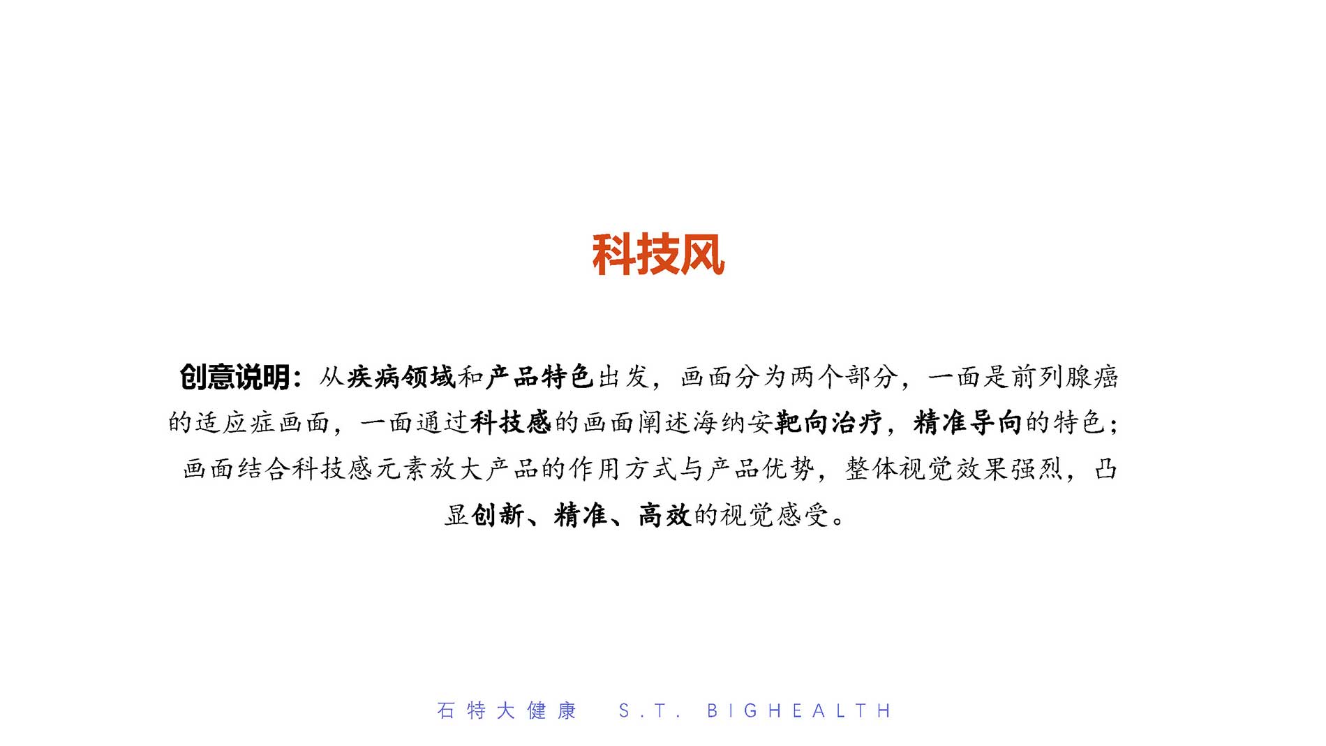 主KV創意說明:從疾病領域和產品特色出發,畫面分為兩個部分,一面是前列腺癌的適應癥畫面,一面通過科技感的畫面闡述海納安靶向治療,精準導向的特色;畫面結合科技感元素放大產品的作用方式與產品優勢,整體視覺效果強烈,凸顯創新、精準、高效的視覺感受。