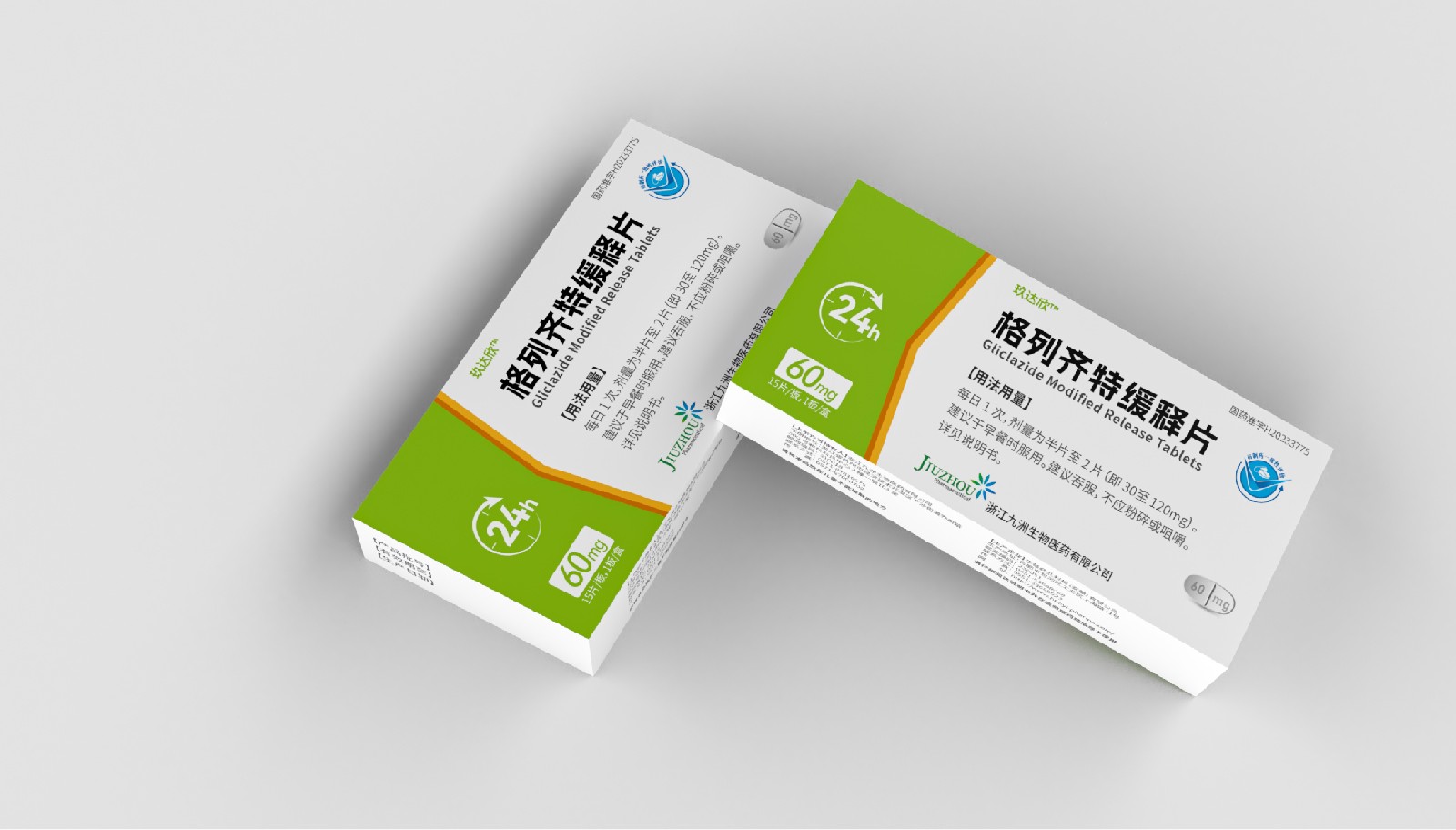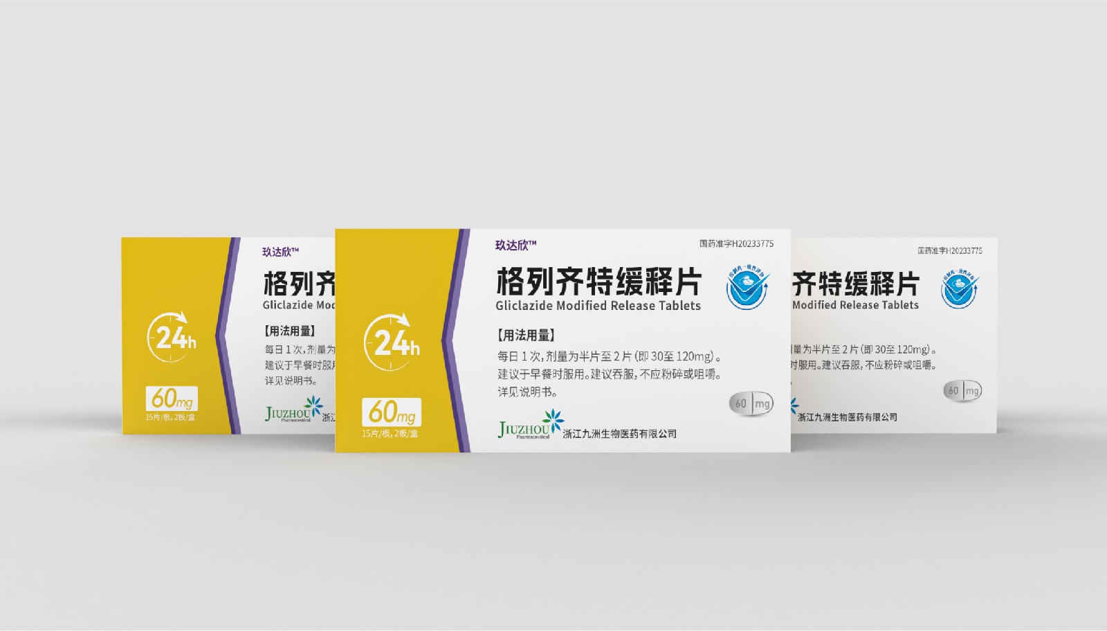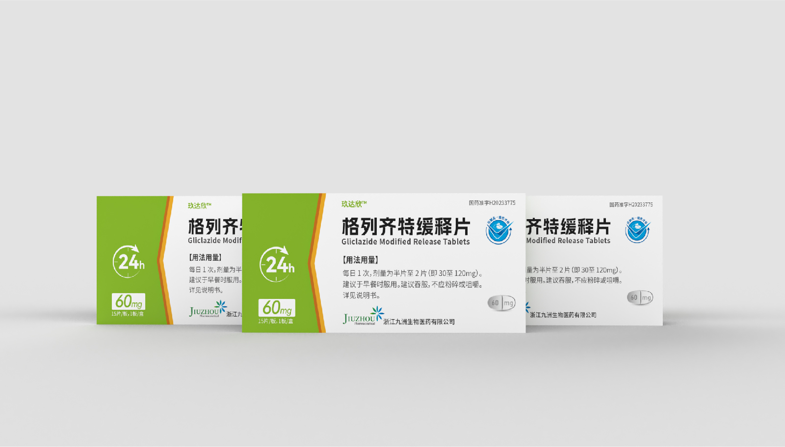 設(shè)計方案中藥效持續(xù)時間作為視覺符號出現(xiàn),起到強調(diào)藥突出作用。強調(diào)用法用量與藥效持續(xù)時間數(shù)字“1”、“24”做傾斜處理體現(xiàn)速度感,在起到突出強調(diào)的同時,也體現(xiàn)藥片控制血糖速度之感。企業(yè)標(biāo)志和企業(yè)名稱結(jié)合使用突出企業(yè)形象。藥片設(shè)計突出單片藥劑量和藥片可掰片使用。