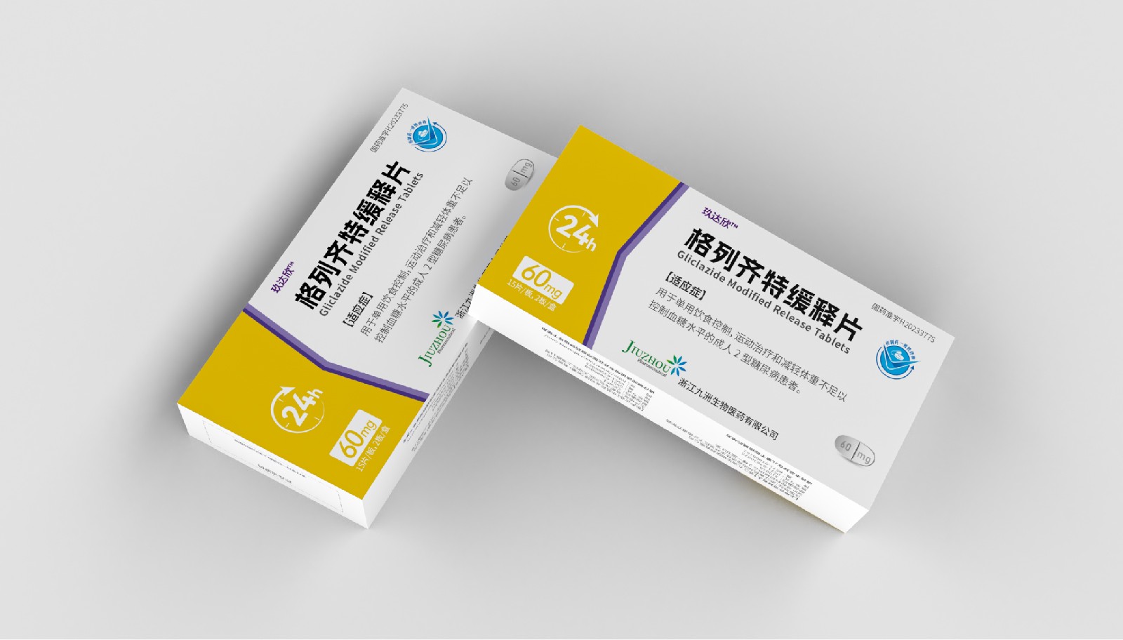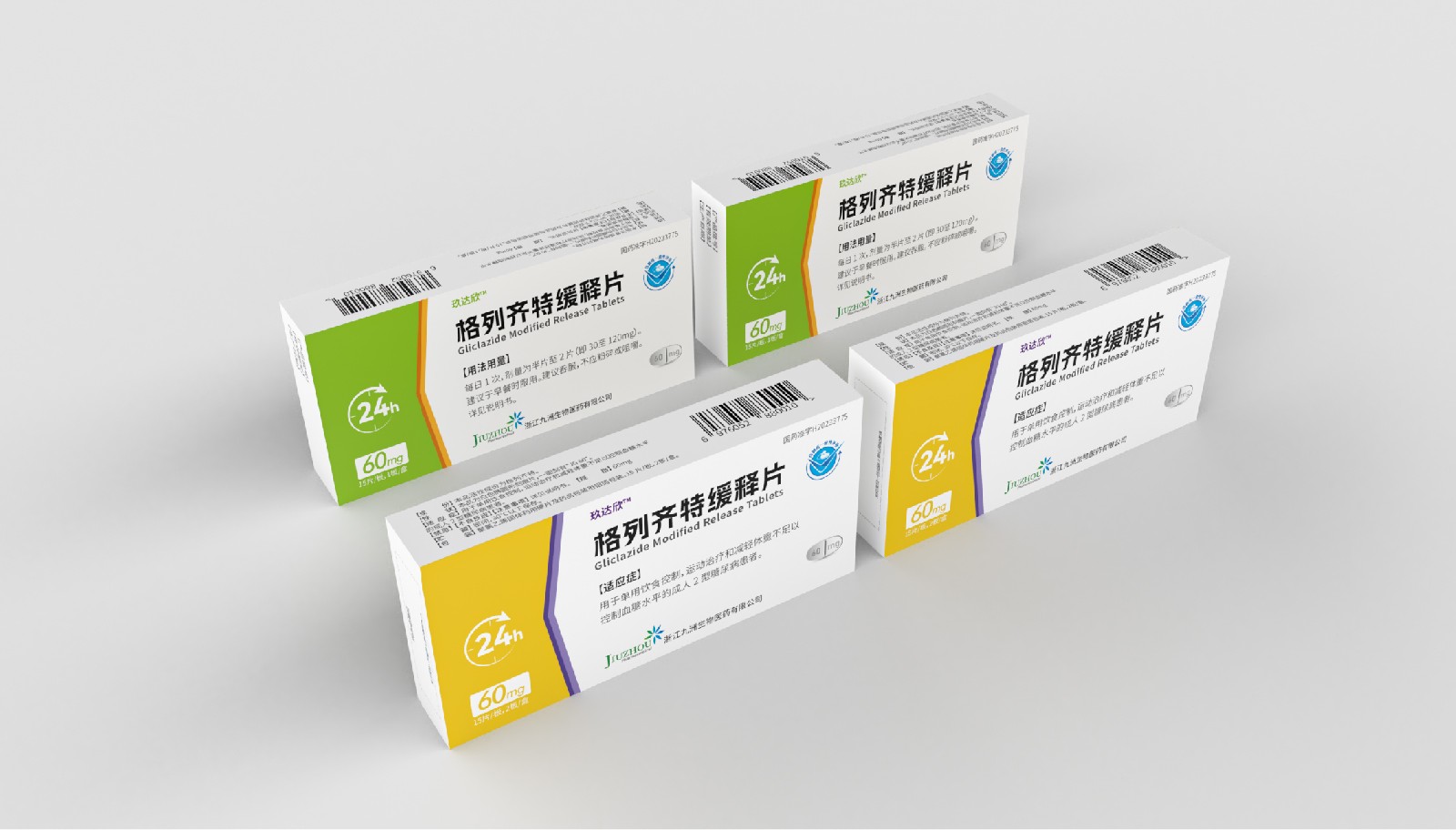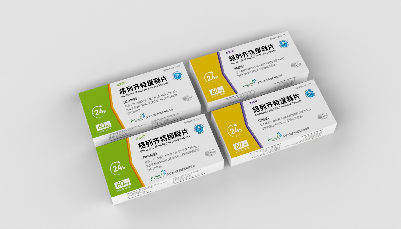 設(shè)計方案中藥效持續(xù)時間作為視覺符號出現(xiàn),起到強調(diào)藥突出作用。強調(diào)用法用量與藥效持續(xù)時間數(shù)字“1”、“24”做傾斜處理體現(xiàn)速度感,在起到突出強調(diào)的同時,也體現(xiàn)藥片控制血糖速度之感。企業(yè)標(biāo)志和企業(yè)名稱結(jié)合使用突出企業(yè)形象。藥片設(shè)計突出單片藥劑量和藥片可掰片使用。