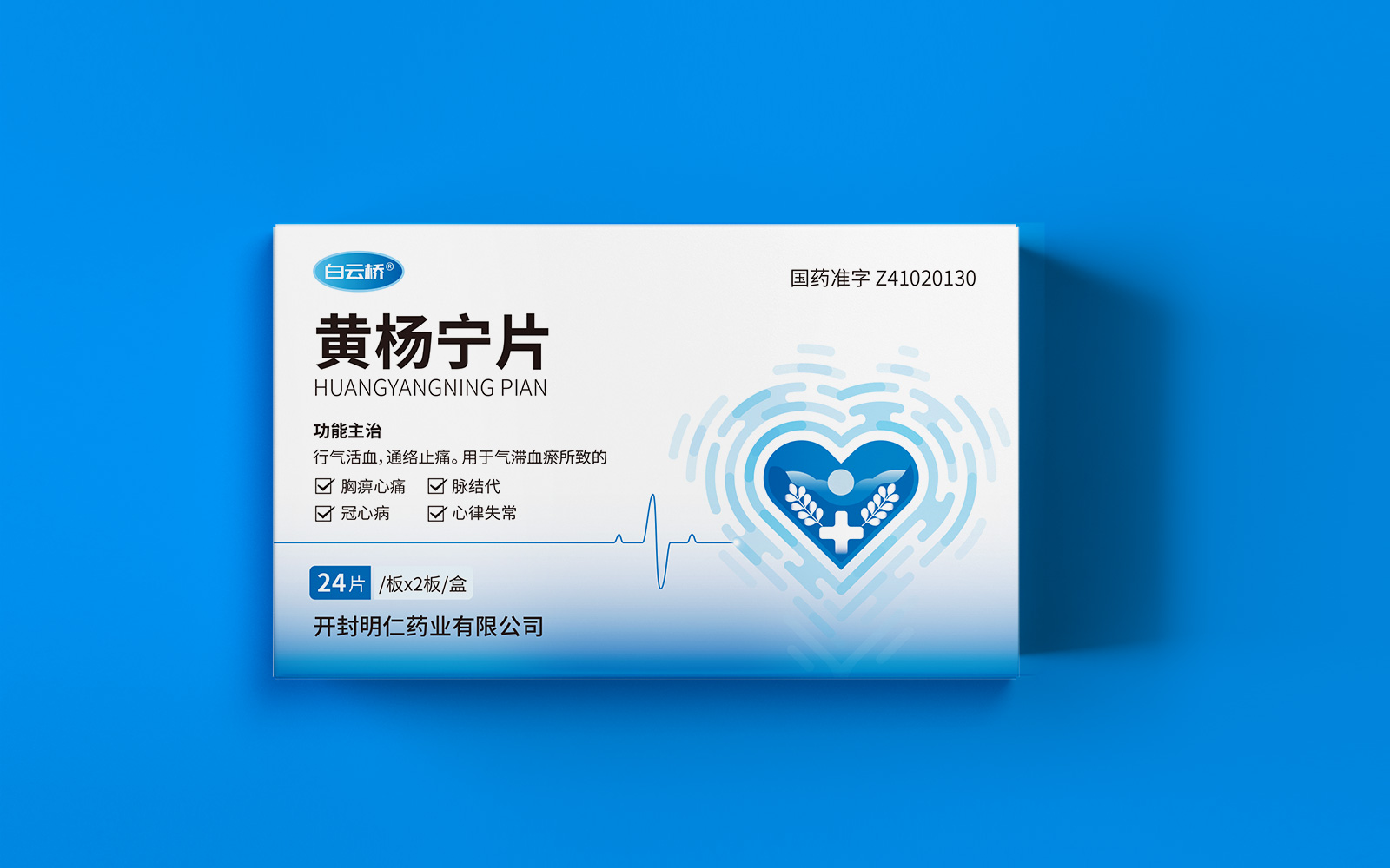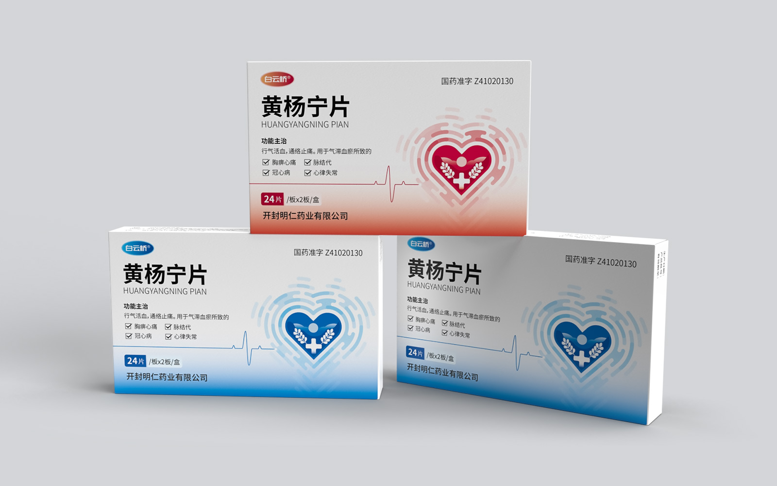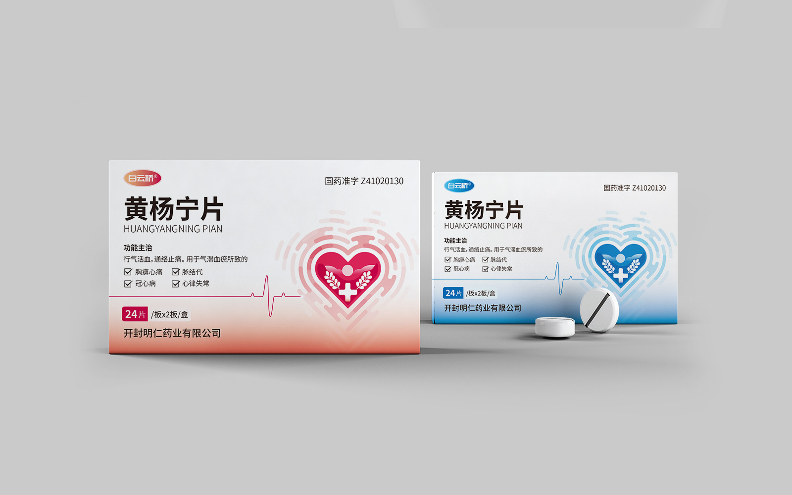 整體畫面以藍色為主,具有涼爽、安靜舒適感覺。藍色有利于病人克制沖動和煩躁,能夠平緩安撫病人的心情。箭頭,體現藥品快速、持久、作用精準,迅速緩解心絞痛等癥狀同時形成獨特圖形符號,符號簡潔,識別度高。心臟圖案,與藥品作用屬性符合加強對藥品的認知與記憶。黃楊葉片與心臟血管相結合,體現純中藥植物提取作用于心腦血管療效。同時結合脈絡線條設計凸顯藥品活血通絡的藥理,便于消費者認知。