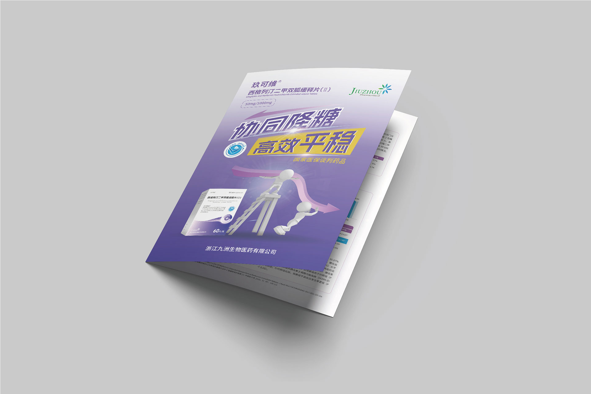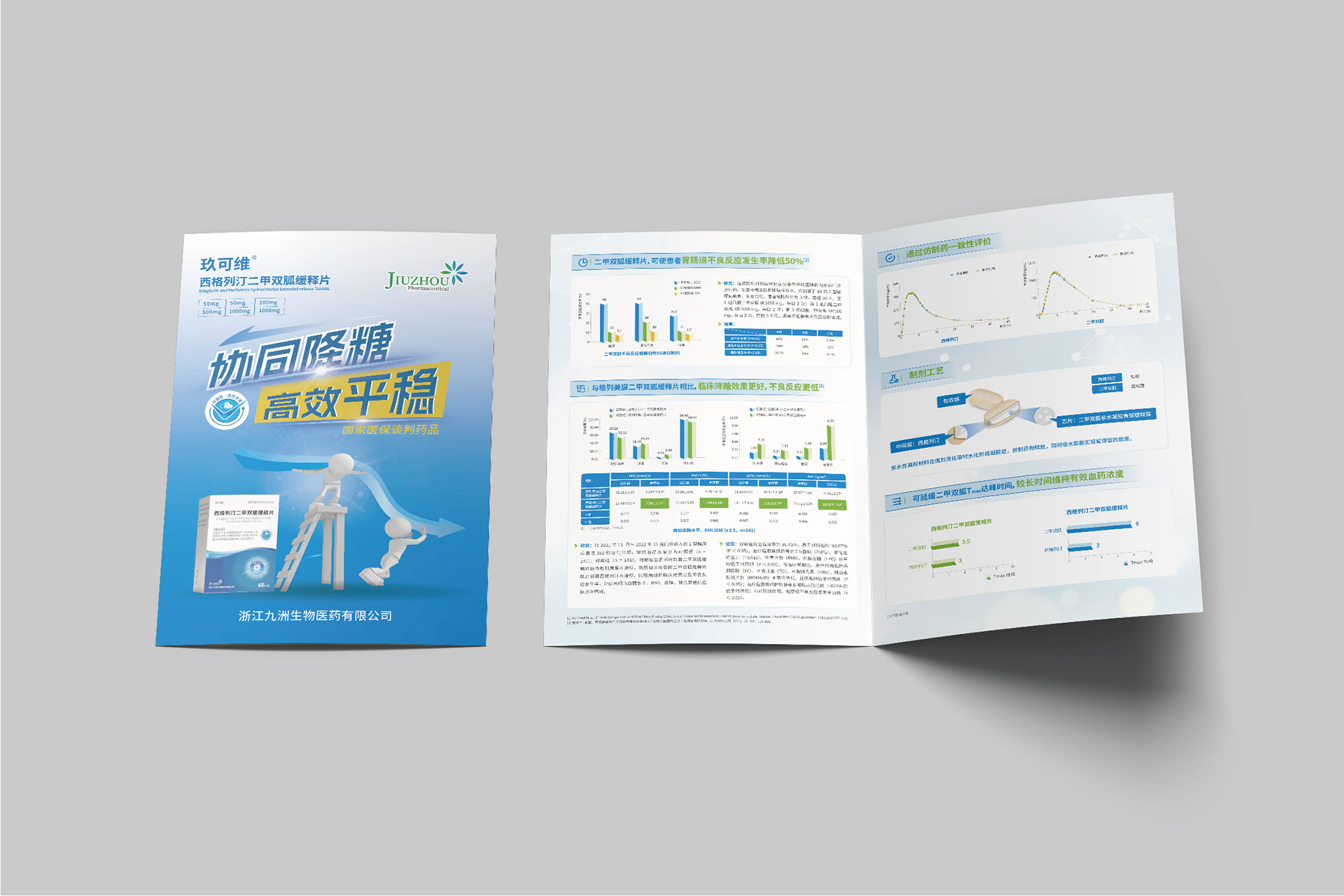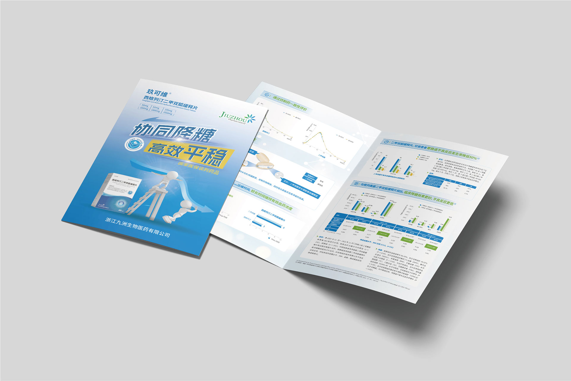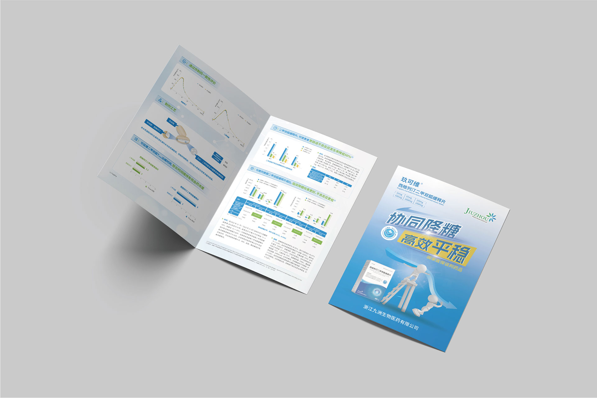 浙江九洲生物醫(yī)藥有限公司(九洲藥業(yè),股票代碼:603456.SH)是國內(nèi)領先的創(chuàng)新藥CDMO企業(yè),其控股子公司研發(fā)的**西格列汀二甲雙胍緩釋片(Ⅱ)**于2024年4月獲國家藥品監(jiān)督管理局注冊證書,主要用于治療2型糖尿病,尤其針對二甲雙胍單藥治療血糖控制不佳或需聯(lián)合用藥的患者。該藥物結(jié)合了磷酸西格列?。―PP-4抑制劑)與二甲雙胍的雙重降糖機制,并通過緩釋技術優(yōu)化藥物吸收效率,減少代謝負擔。為配合藥品上市推廣及國家藥品集采中標后的市場布局,需通過專業(yè)宣傳物料(DA宣傳折頁、易拉寶)傳遞藥品核心優(yōu)勢,提升醫(yī)生、患者及渠道商的認知度。