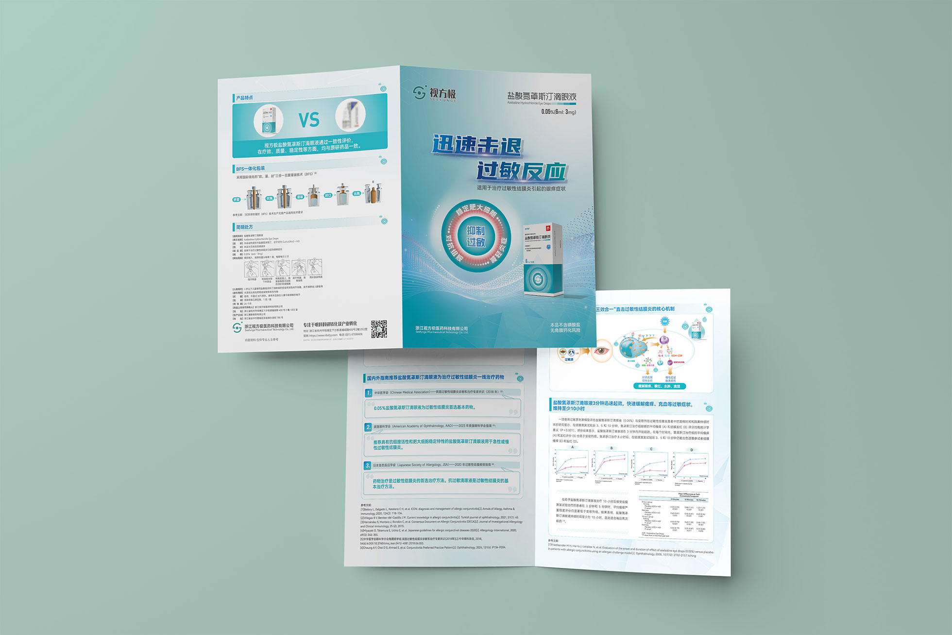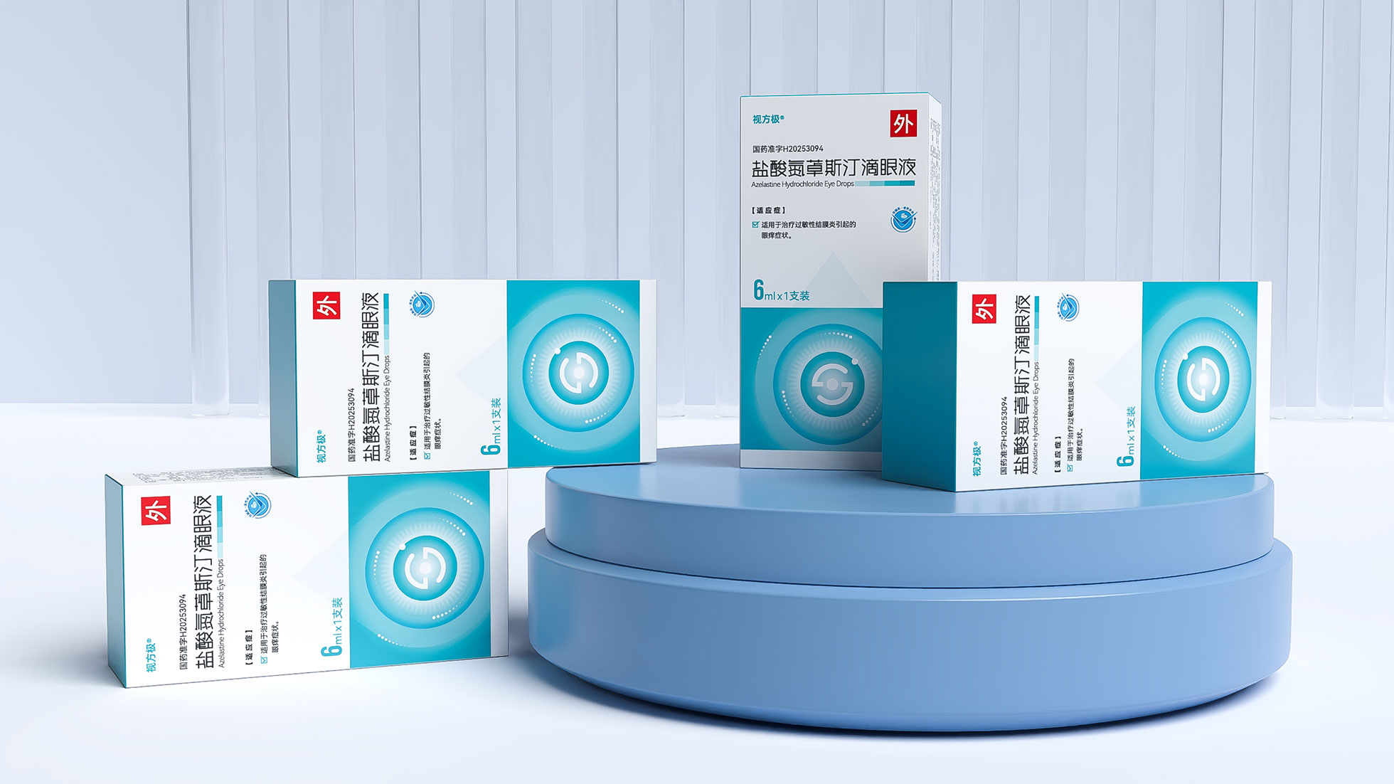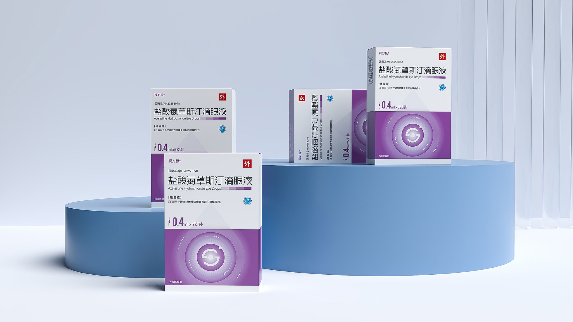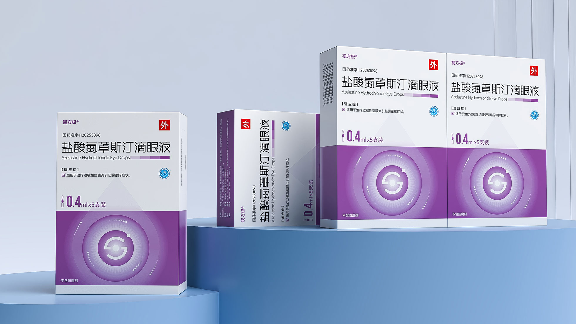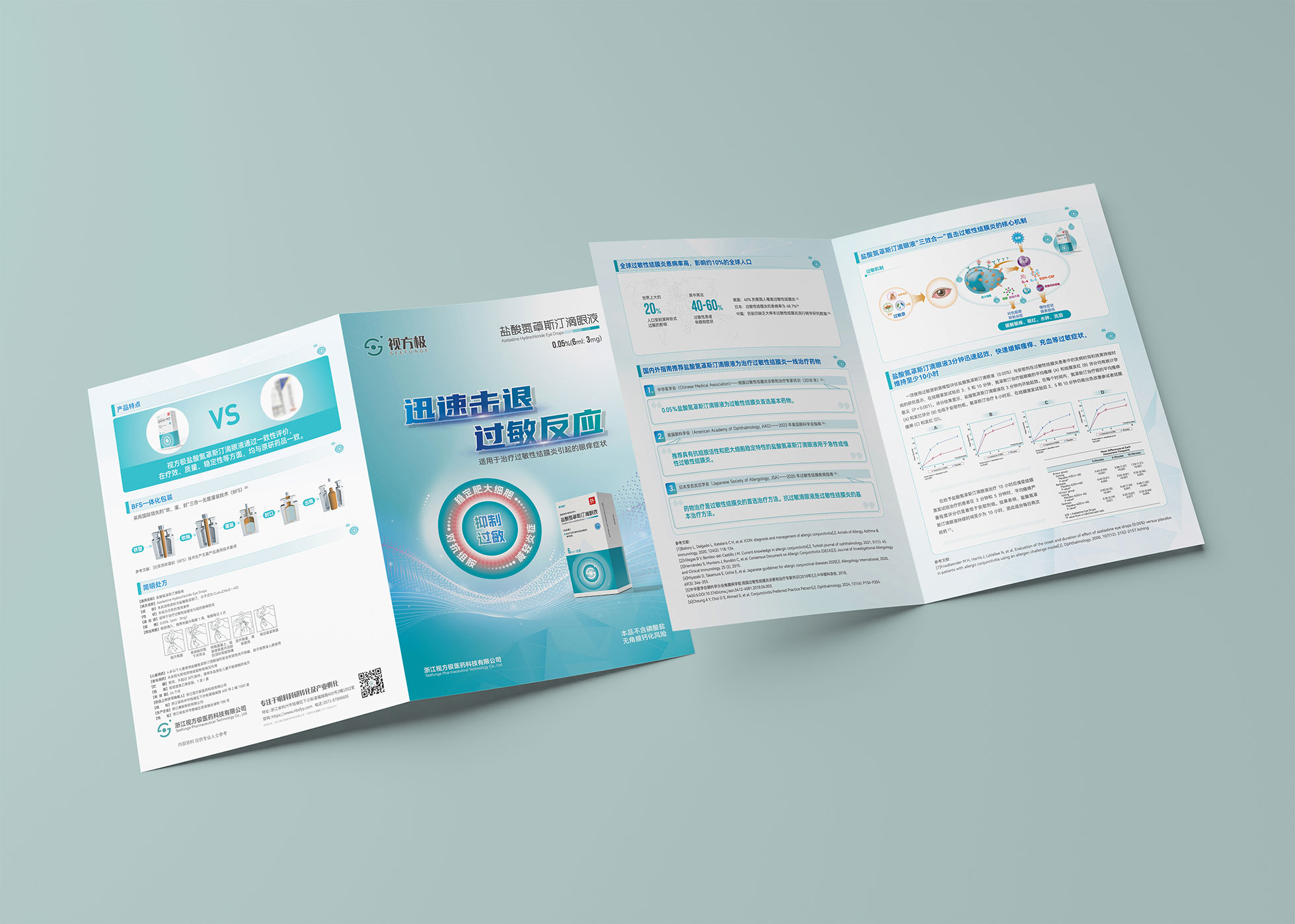 本項目是石特大健康為浙江視方極醫藥科技有限公司的核心產品——鹽酸氮?斯汀滴眼液,所提供的從終端包裝到專業DA(Detail Aid) 的一站式整合設計服務。該產品用于治療過敏性結膜炎,其市場成功既依賴于在藥店貨架上對消費者的直接吸引力,也離不開面向眼科醫生的專業學術推廣。我們的挑戰在于,如何構建一個統一的品牌視覺體系,使其在包裝上能清晰傳遞產品功效、激發購買欲望,同時在DA上能專業地呈現藥物機理和臨床優勢,成為醫生可信賴的處方依據,最終實現“藥店動銷”與“臨床推廣”的雙輪驅動。