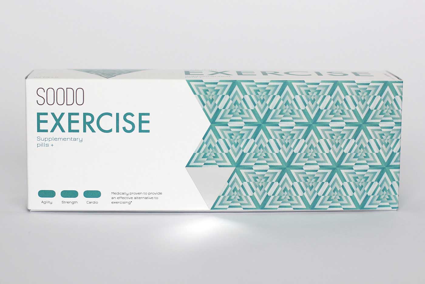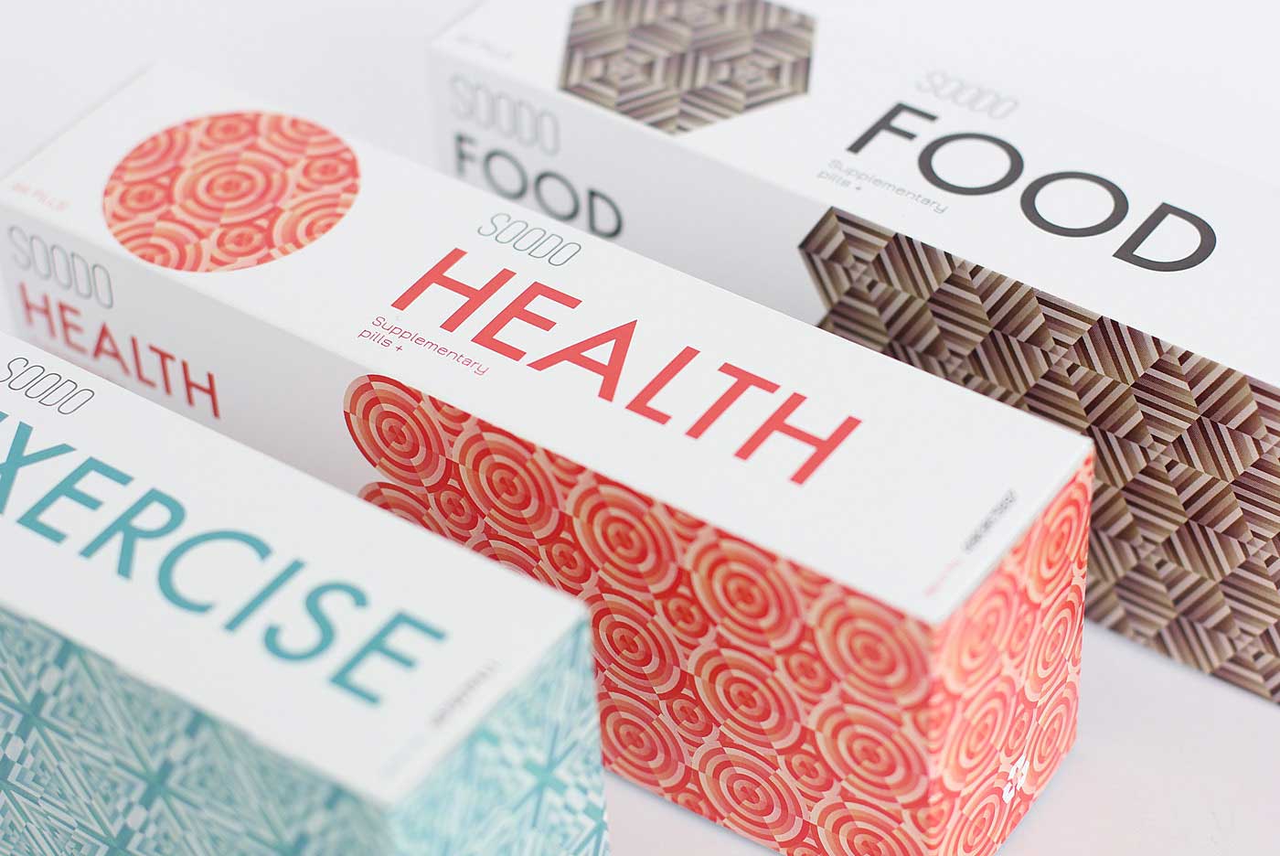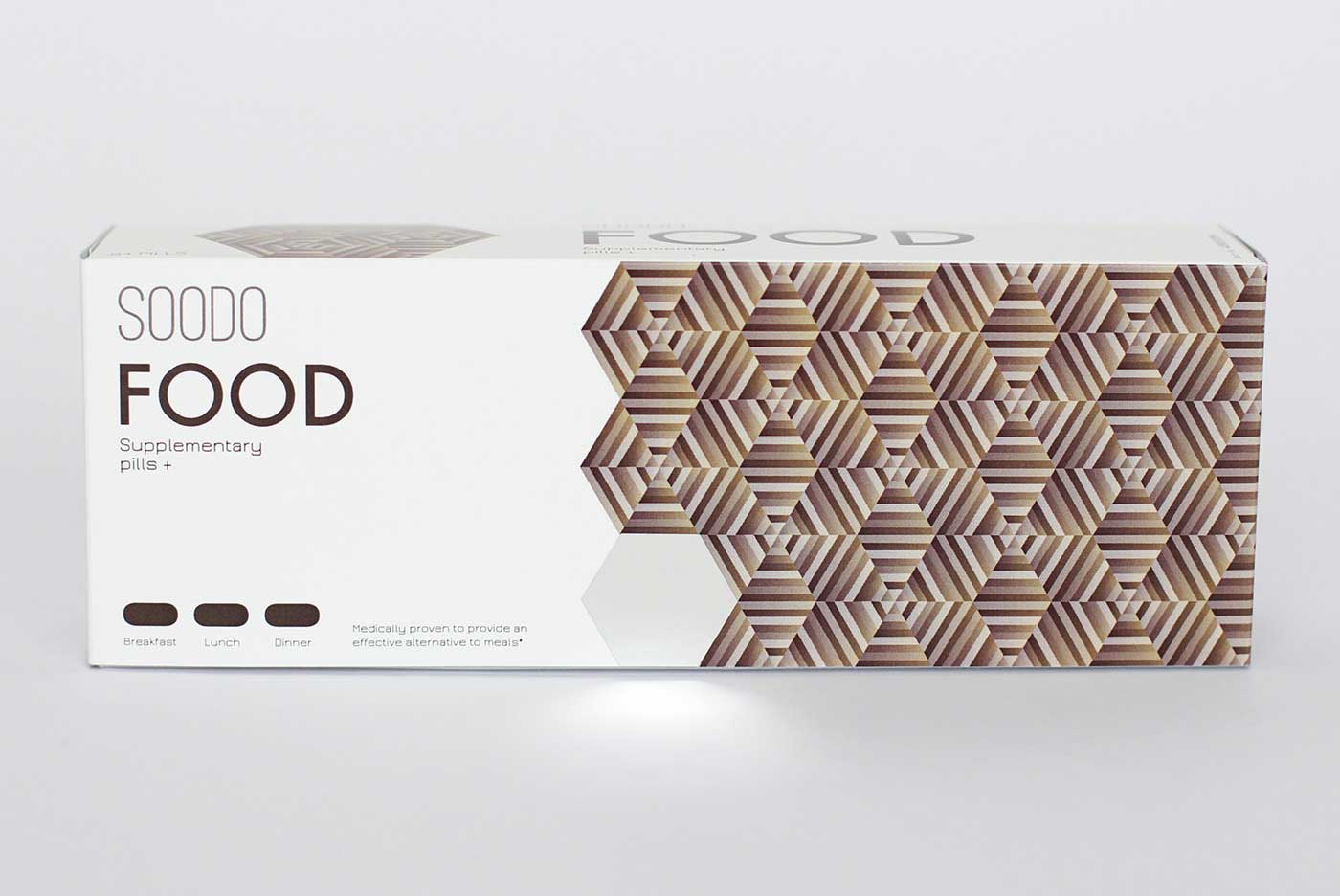 品牌名稱(chēng)“SOODO”是通過(guò)將原始詞“偽”的發(fā)音,即不假的,有誤導(dǎo)性的。消除創(chuàng)造健康生活的所有自然方式的想法,導(dǎo)致失去與這些活動(dòng)相關(guān)的重要的社會(huì)互動(dòng)。我想要設(shè)計(jì)方法來(lái)反映這樣一個(gè)悲劇的后果。產(chǎn)品包裝采用幾何圖形進(jìn)行設(shè)計(jì),用漸變的方法使圖案更抽象化,表達(dá)補(bǔ)藥對(duì)人體產(chǎn)生的微妙變化。